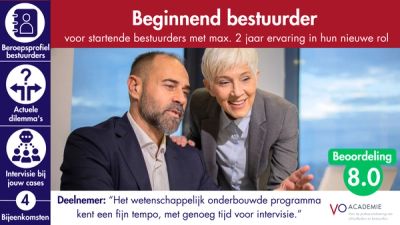 Ben jij gestart als bestuurder en wil je samen met andere beginnende bestuurders de diversiteit van het beroep verkennen? Om je te faciliteren in je nieuwe rol biedt de VO-academie het leertraject Beginnend bestuurder. Tijdens dit traject vorm je een realistisch beeld van het beroep en krijg je inzicht in de kwaliteiten die je bezit om deze functie uit te oefenen.