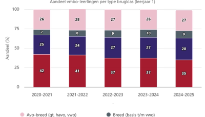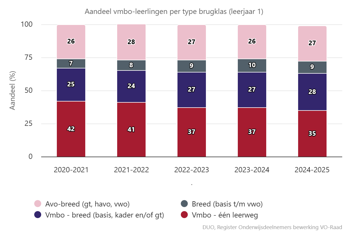 Het aandeel leerlingen dat in een vmbo-brede brugklas of een brugklas met meerdere onderwijsrichtingen (avo-breed of breed) begint, is de afgelopen jaren gestegen. Ook in het tweede leerjaar zit nog iets meer dan 45 procent van de leerlingen in een klas met meerdere leerwegen of onderwijsrichtingen. De toename van het aantal leerlingen die starten in een brede brugklas is een bemoedigende ontwikkeling die wij toejuichen. Brede brugklassen zorgen ervoor dat leerlingen vaker beter presteren dan op grond van het basisschooladvies mag worden verwacht. Ook is de drempel om vanuit een brede brugklas door te stromen naar een andere onderwijsrichting relatief laag voor leerlingen. Deze brugklassen kunnen daarmee met name de kansen vergroten voor leerlingen die - omdat ze bijvoorbeeld uit een achterstandssituatie komen - een niet passend schooladvies hebben gekregen en/of op wat latere leeftijd excelleren.