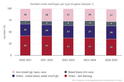 De rapportage laat zien dat het vmbo een stevige basis vormt voor vervolgonderwijs en werk. Het vmbo kent de hoogste slagingspercentages van alle onderwijsrichtingen. In schooljaar 2024–2025 slaagde 97 procent van de leerlingen in de basisberoepsgerichte leerweg, 95 procent in de kaderberoepsgerichte leerweg en 92 procent in de gemengde/theoretische leerweg. Ook de doorstroom naar het mbo is groot: negen op de tien geslaagde vmbo-leerlingen stonden een jaar later ingeschreven bij een mbo-instelling.