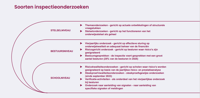 De Onderwijsinspectie heeft een repertoire aan onderzoeken op zowel school-, bestuurs- of stelselniveau. De bestuurs- en schoolonderzoeken worden door de eigen inspecteurs uitgevoerd. Voor stelselonderzoeken maakt de Inspectie daarnaast ook gebruik van externe onderzoeksbureaus.