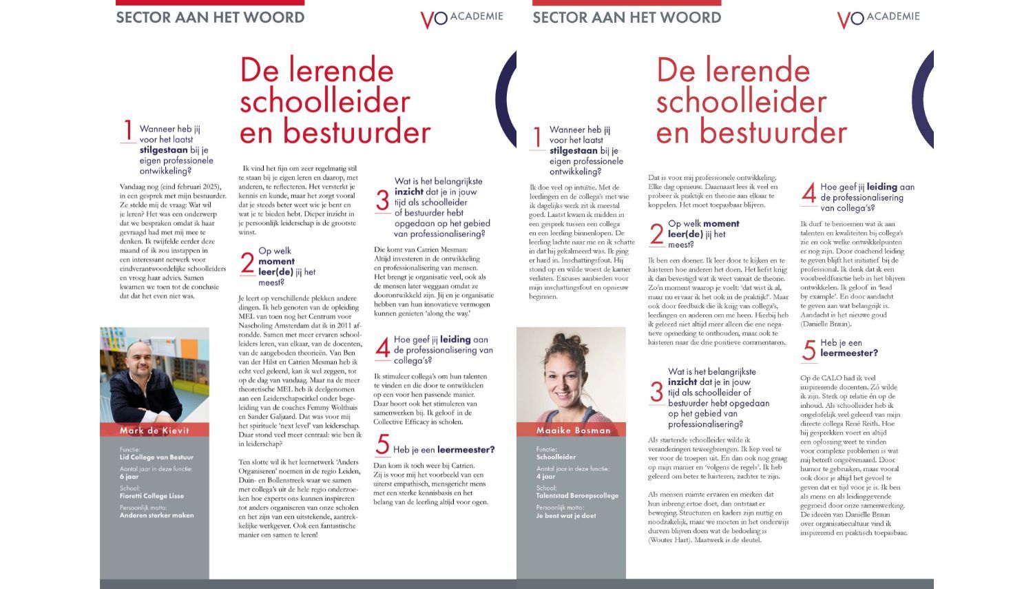 In de reeks 'Sector aan het woord’ geven schoolleiders en bestuurders een inkijkje in hun dagelijkse praktijk en professionele ontwikkeling. Iedere maand leggen we een schoolleider of bestuurder een aantal vragen voor over het thema ‘leren en professionaliseren’. Hoe geef je leiding aan de professionalisering van collega's? En op welke momenten leer je zelf het meest? Laat je inspireren door hoe collega's invulling geven aan het thema leren en professionaliseren.